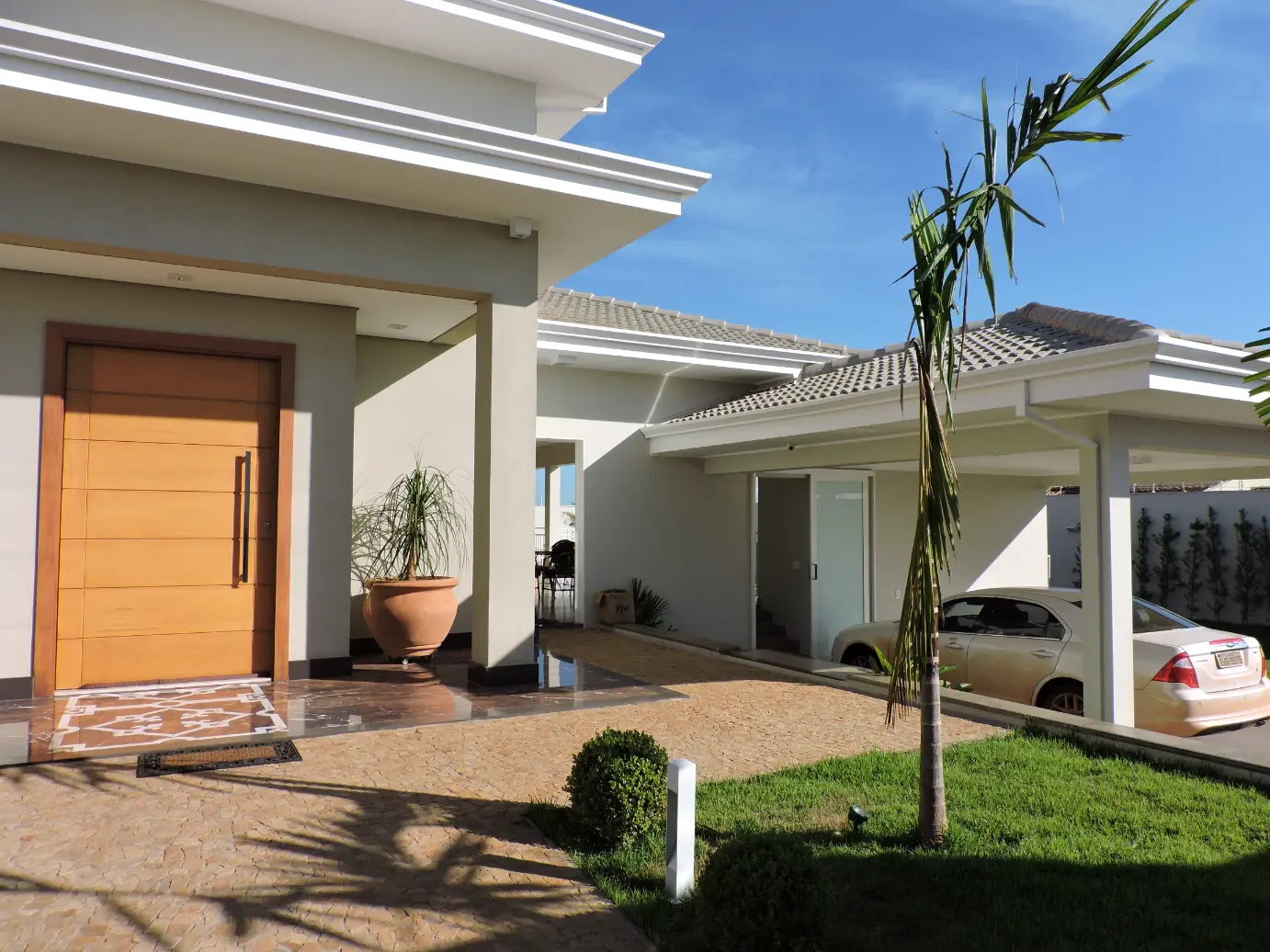 A composição em tons neutros reforça a sobriedade do projeto, enquanto o portão integrado e o acesso social bem definido garantem funcionalidade no uso diário. O telhado aparente, com inclinação suave, contribui para o conforto térmico e para o equilíbrio entre simplicidade construtiva e elegância arquitetônica.